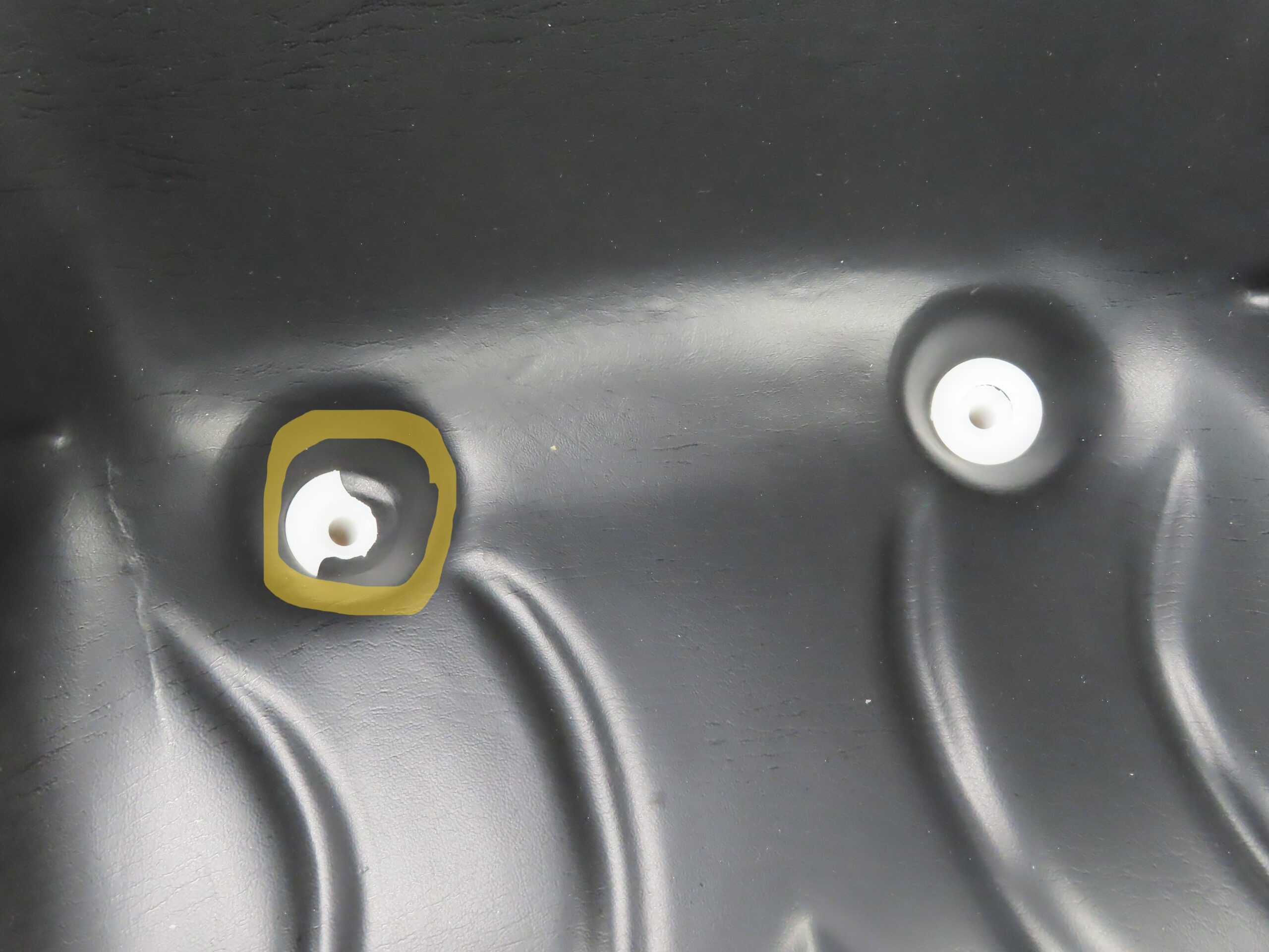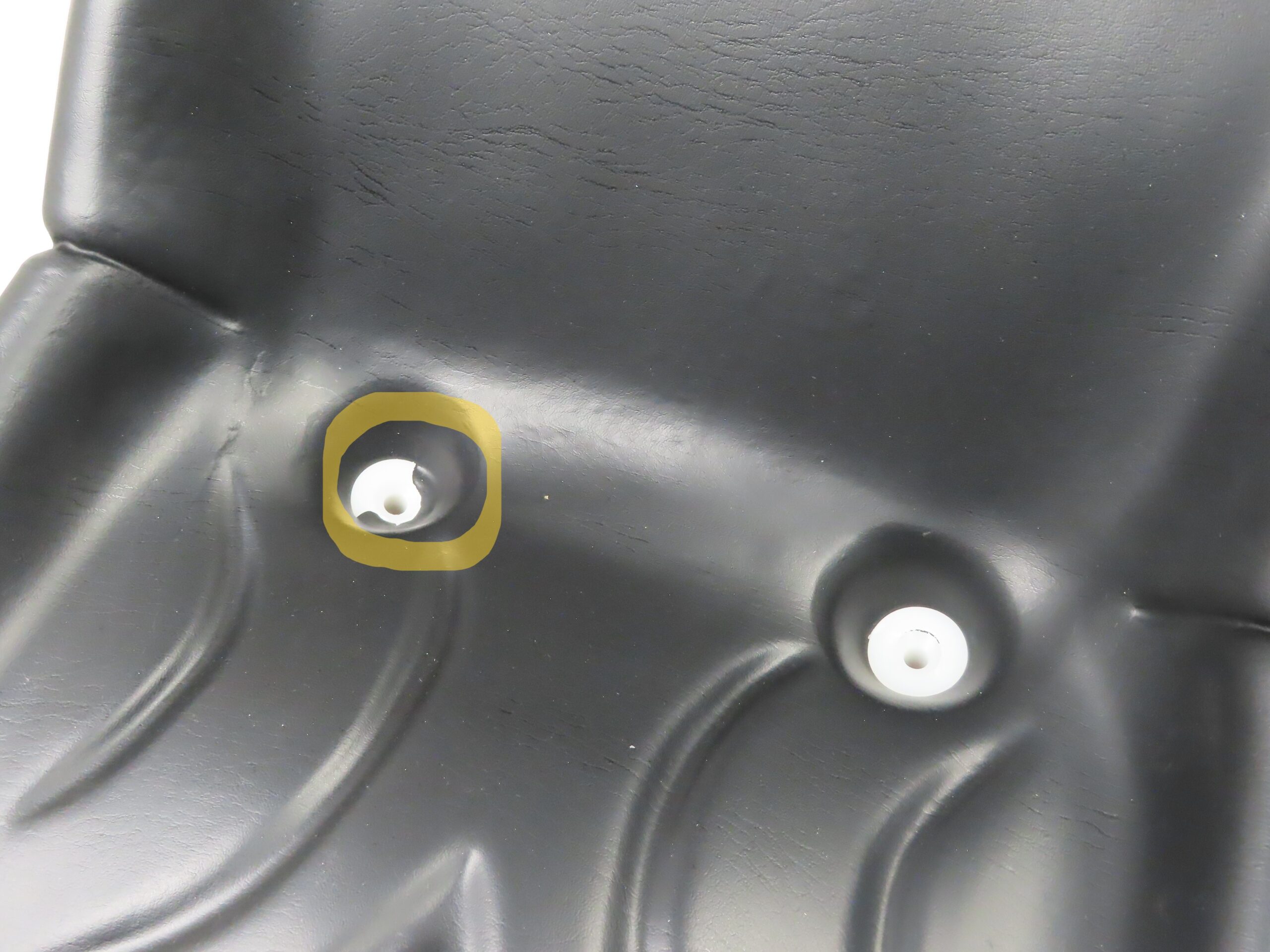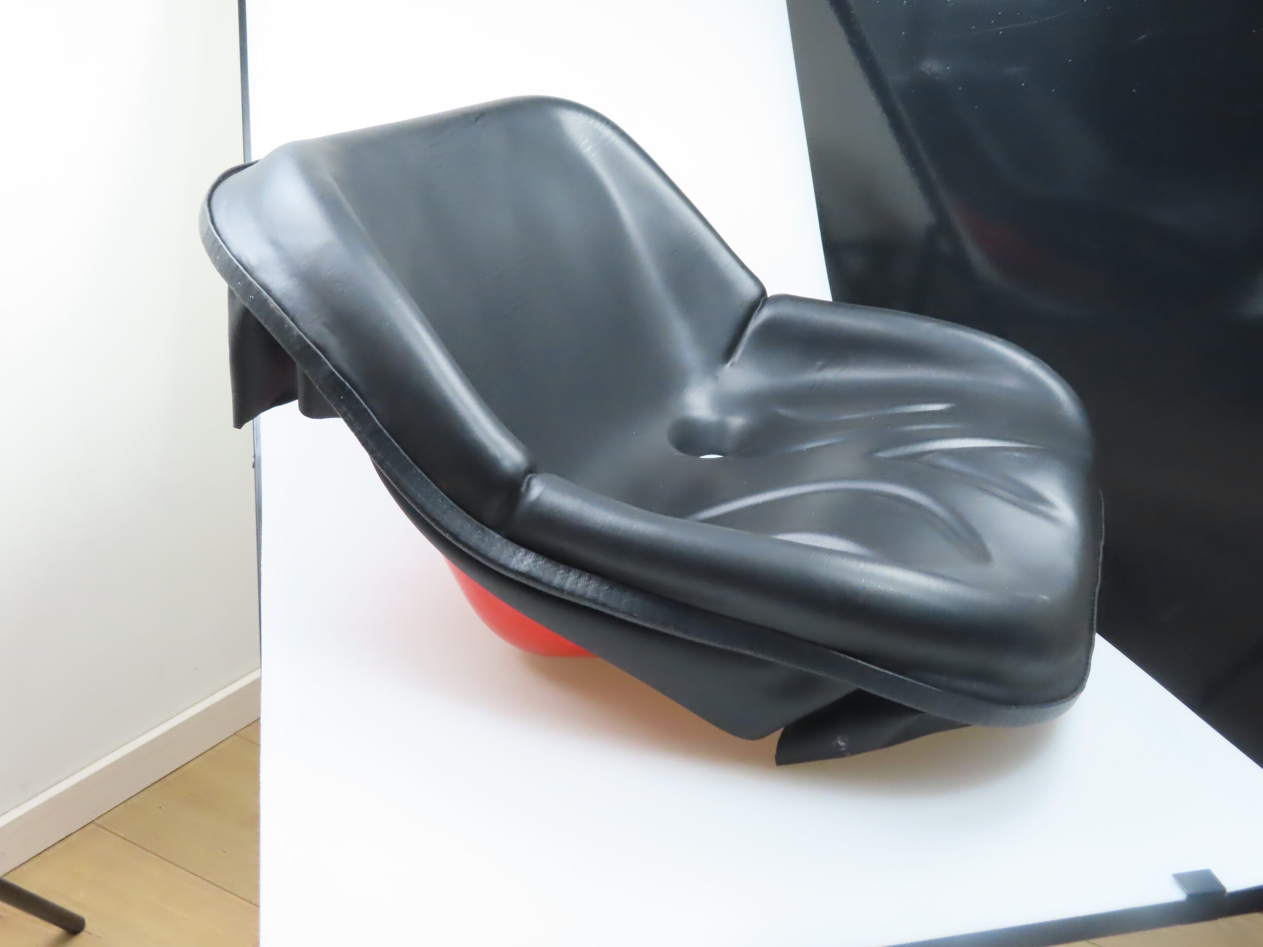 Stuhl in Kubota Orange mit schwarzer Polsterung. Der Stuhl hat eine gebrochene Kappe zur Entwässerung siehe Bilder